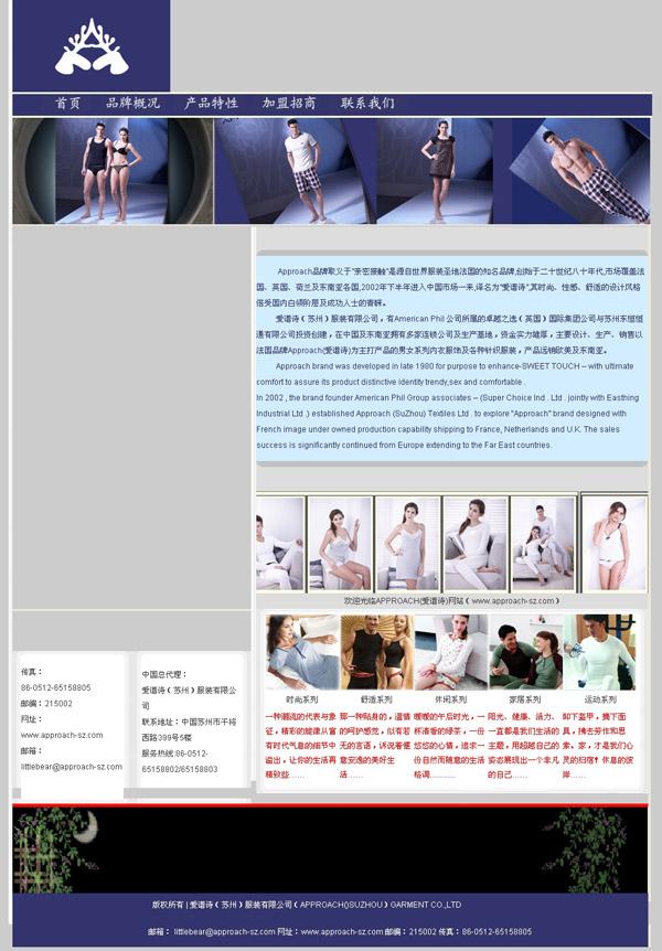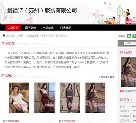 愛譜詩(蘇州)妝扮有限公司,有American Phil 公司所屬的良好之選(英國)國際團體公司與蘇州東恒恒通有限公司投資創(chuàng)建,在中國及東南亞擁有多家連鎖公司及生產(chǎn)基地,資金力氣雄厚,緊急操持、生產(chǎn)、販賣以法國品牌Approach(愛譜詩)為主打產(chǎn)物的男女系列褻服衣飾及種種針織妝扮,產(chǎn)物遠銷西歐及東南亞。