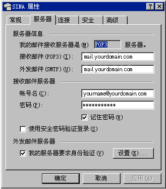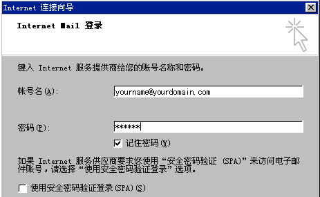 yourname@yourdomain.com;為了確保安全,密碼顯示為星號。如果您沒有輸入密碼或輸入密碼有誤,系統(tǒng)會(huì)在接收郵件時(shí)提示您輸入密碼。