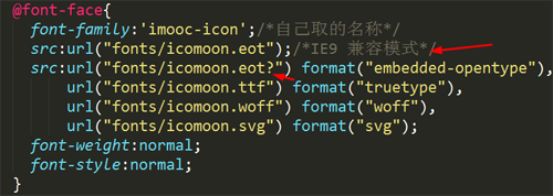 src:url("fonts/icomoon.eot") format("embedded-opentype"),/*后綴為eot,format對應(yīng)的字符串*/