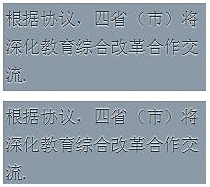 <head> <meta charset="UTF-8"> <title>Document</title> <style> body{ font: 110%/1.6 Baskerville, Palatino, serif; /*字體過小表現(xiàn)不出樣式*/ } .wrap{ width: 200px; background: hsl(210, 13%, 60%); color: hsl(210, 13%, 30%); padding: .1em; text-shadow: 0 1px 1px hsla(0, 0%, 100%, .8); } .wrap02{ margin-top: 10px; width: 200px; background: hsl(210, 13%, 60%); color: hsl(210, 13%, 30%); padding: .1em; text-shadow: 0 -1px 1px hsla(0, 0%, 100%, .8); } </style> </head> <body> <div class="wrap"> <span>根據(jù)協(xié)議,四省(市)將深化教育綜合改革合作交流.</span> </div> <div class="wrap02"> <span>根據(jù)協(xié)議,四?。ㄊ校⑸罨逃C合改革合作交流.</span> </div> </body>